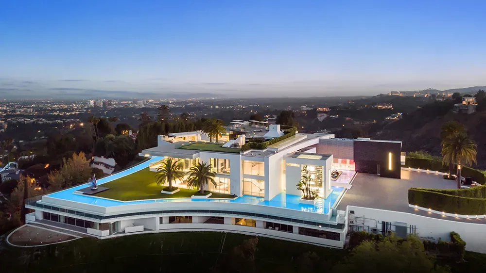 The amenities are what you would expect from a home of this scale. It boasts 21 bedrooms, 42 bathrooms, a 30-car garage, a 40-seat movie theater, and a bowling alley. Outside, you'll find multiple swimming pools, including a massive infinity pool that wraps around the property, offering breathtaking views of Los Angeles.